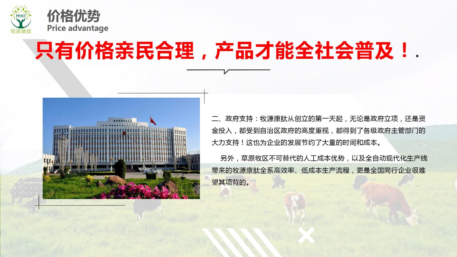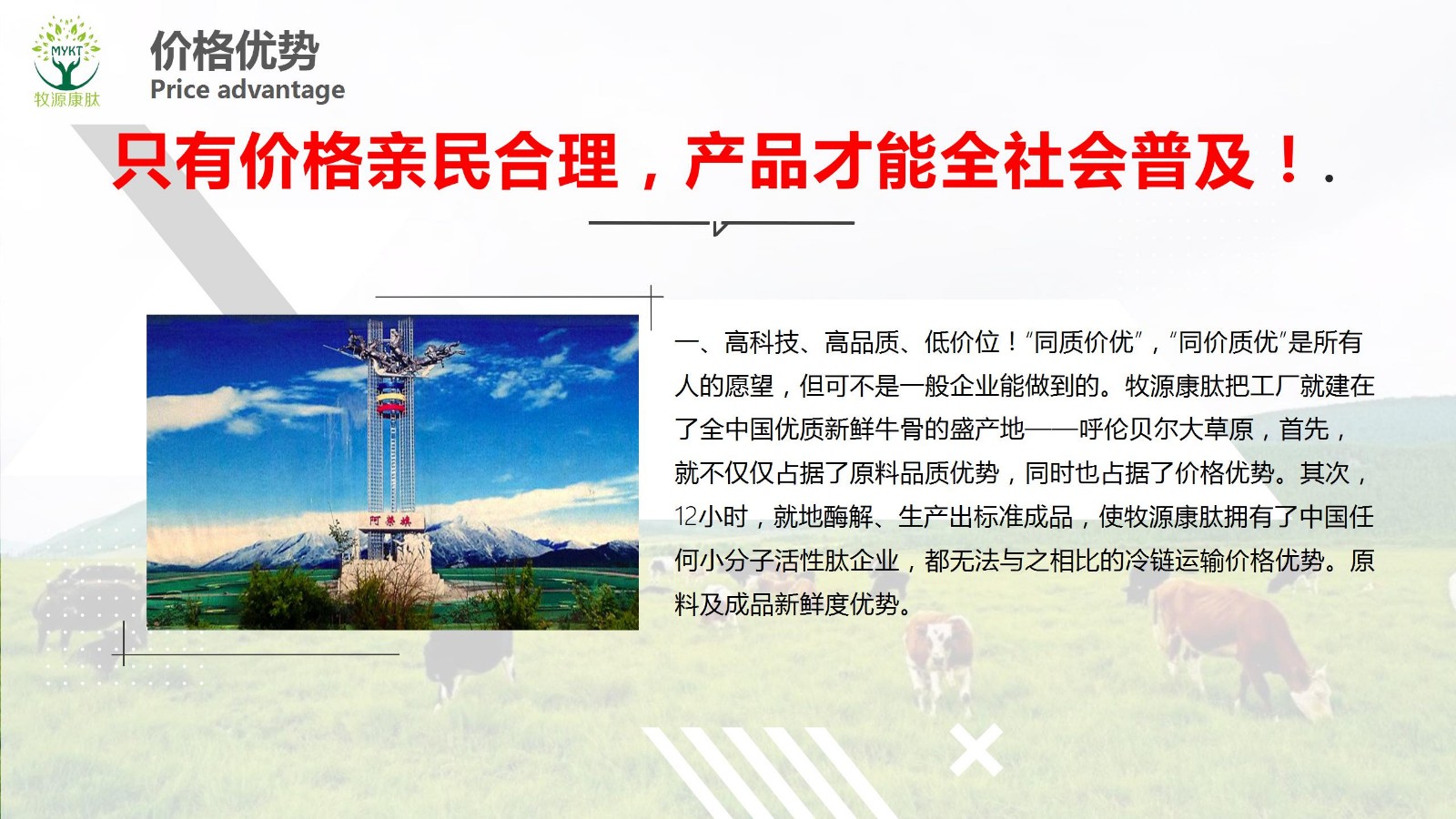 摘要:只有價格親民合理,產(chǎn)品才能全社會普及!高科技、高品質(zhì)、低價位!“同質(zhì)價優(yōu)”,“同價質(zhì)優(yōu)”是所有人的愿望,但可不是一般企業(yè)能做到的。牧源康肽把工廠就建在了全中國優(yōu)質(zhì)新鮮牛骨的盛產(chǎn)地——呼倫貝爾大草原,首先,就不僅僅占據(jù)了原料品質(zhì)優(yōu)勢,同時也占..